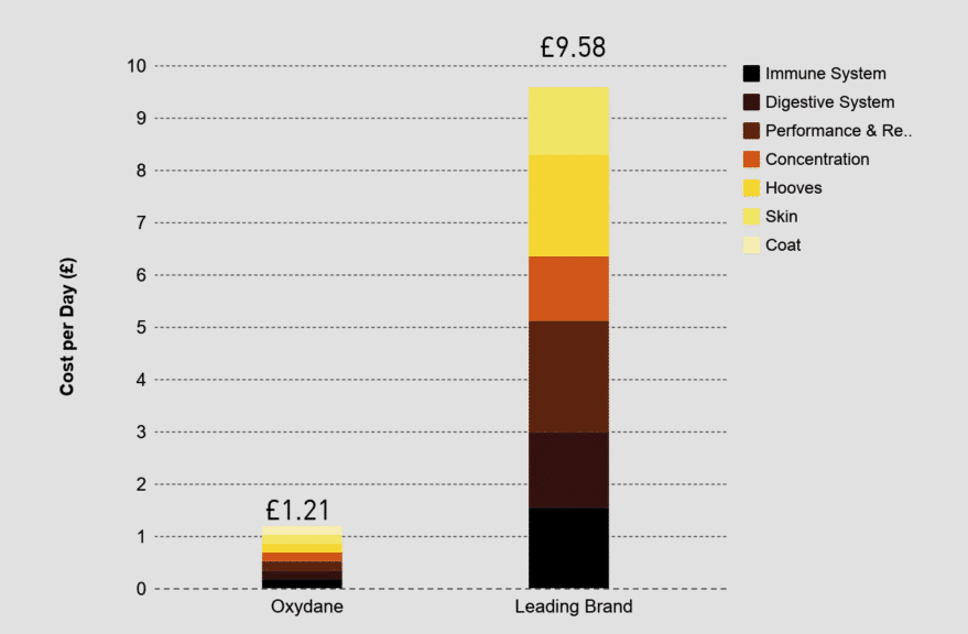 A 5Kg tub of Oxydane (£320) with a horse in medium work, fed at 15 g per day will last approximately 333 days = 0.97 per day or a horse in heavy work, fed at 20g per day will last approximately 250 days = £1.28 per day.