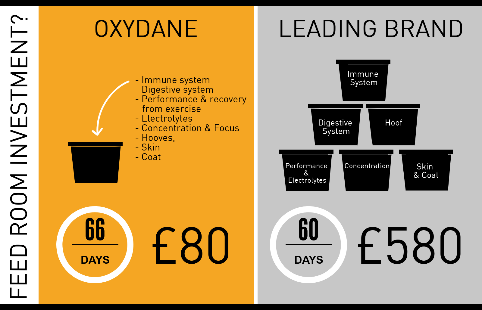 In today’s current climate where we are looking for cost effective solutions you may just have found what you have been looking for. From our study across feed cost, returning your horse to a natural diet with Oxydane will not only save you money but also give you a far healthier horse.