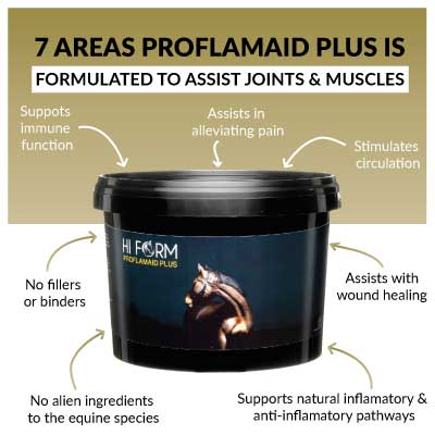 ProflamAid Plus, Hi Form’s joint & muscle supplement, is focussed on the musculoskeletal system of our horses which includes bones, cartilage, joints and soft tissues as, after all, everything is connected. It is formulated to assist & support the healing of normal joint and muscle function by supporting the natural inflammatory and anti-inflammatory pathways. The synergistic action of herbal and nutritional ingredients have a strong effect in helping the immune system and the healing process.